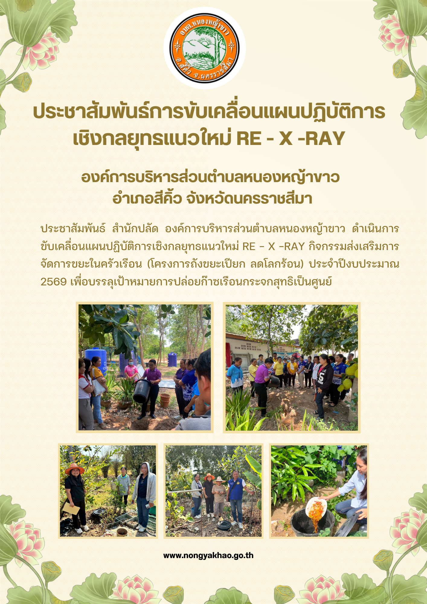 ประชาสัมพันธ์ สำนักปลัด องค์การบริหารส่วนตำบลหนองหญ้าขาว ดำเนินการขับเคลื่อนแผนปฏิบัติการเชิงกลยุทธแนวใหม่ RE - X -RAY กิจกรรมส่งเสริมการจัดการขยะในครัวเรือน (โครงการถังขยะเปียก ลดโลกร้อน) ประจำปีงบประมาณ 2569 เพื่อบรรลุเป้าหมายการปล่อยก๊าซเรือนกระจกสุทธิเป็นศูนย์